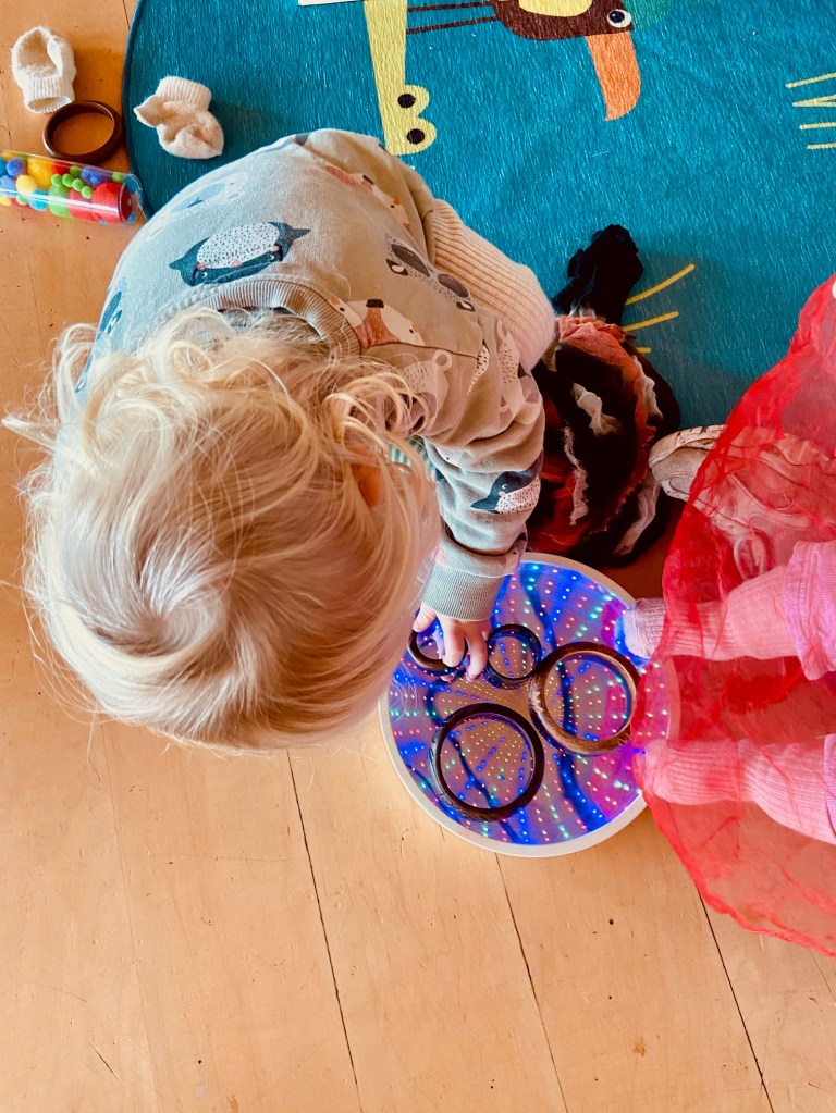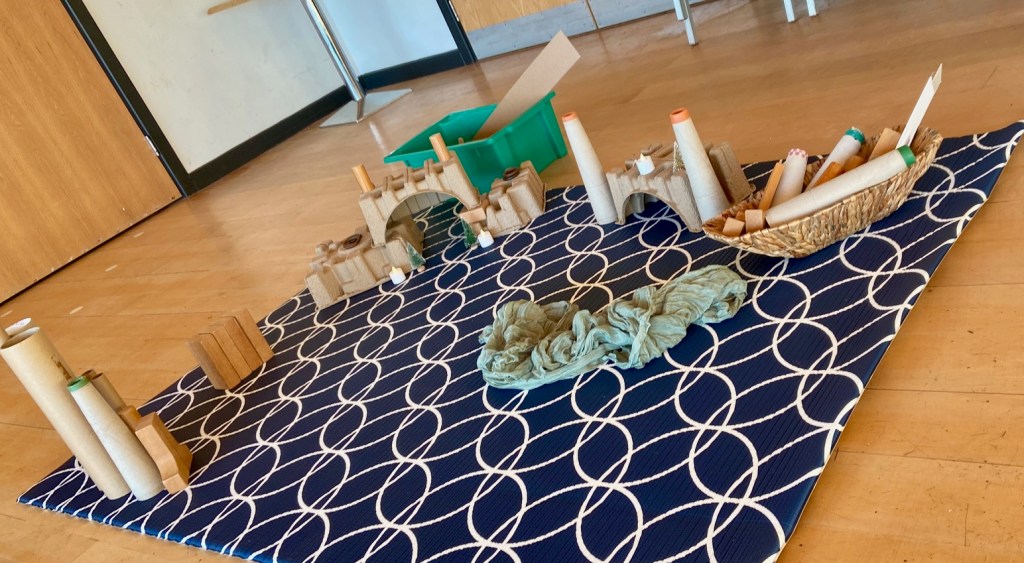 On the ‘quieter’ side of the room, we had some sensory items, a large play mat with wooden blocks, cardboard tubes and pieces, tealights and tree figures. We often take a trip to The Hub Scrapstore in Yeovil (if you haven’t been yet – you must take a trip), to stock up on a range of donated materials. Marzena, who works there, has a wealth of creative knowledge and can provide fantastic ideas of materials and projects. Our large cardboard tubes and cut off pieces come from here – which offer great open-ended materials for children to investigate. Interestingly, the green floaty material left on the mat was extremely popular (lots of children running around the room with it), which has provoked us to provide a materials basket for the next creative play session. When we notice interests and curiosities of the children, we will try to bring these into the play and environment, so that children can explore these on a deeper level.