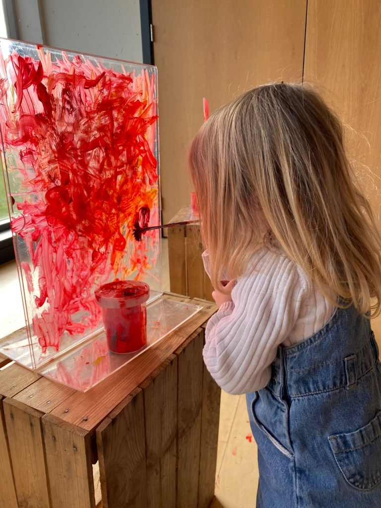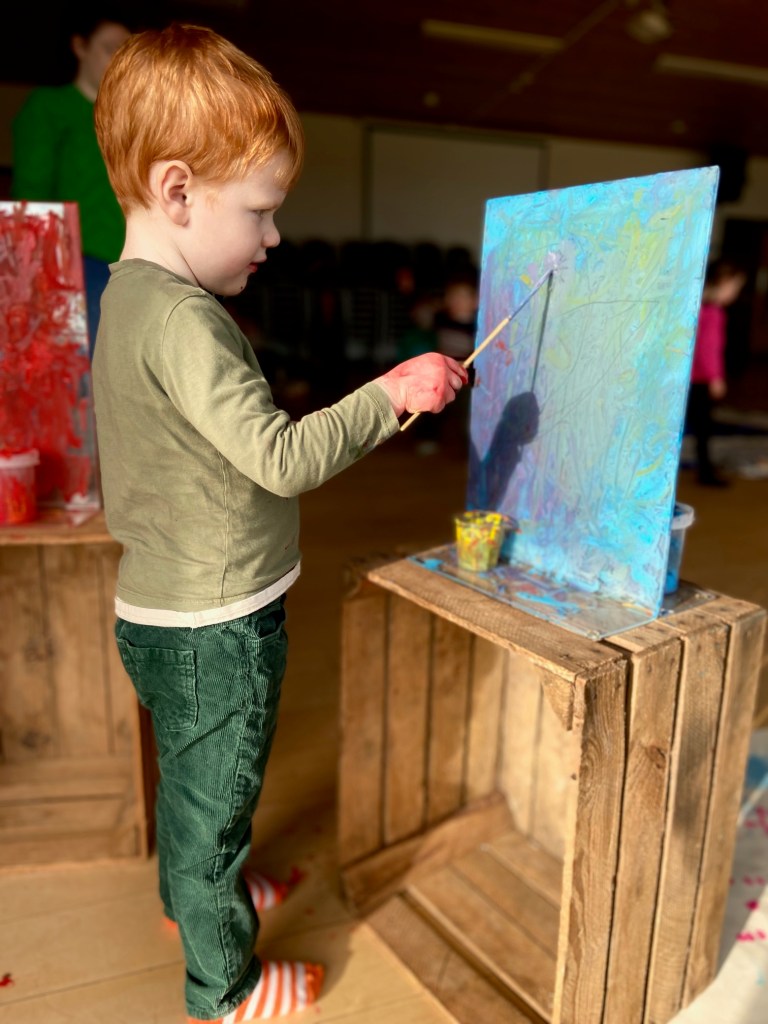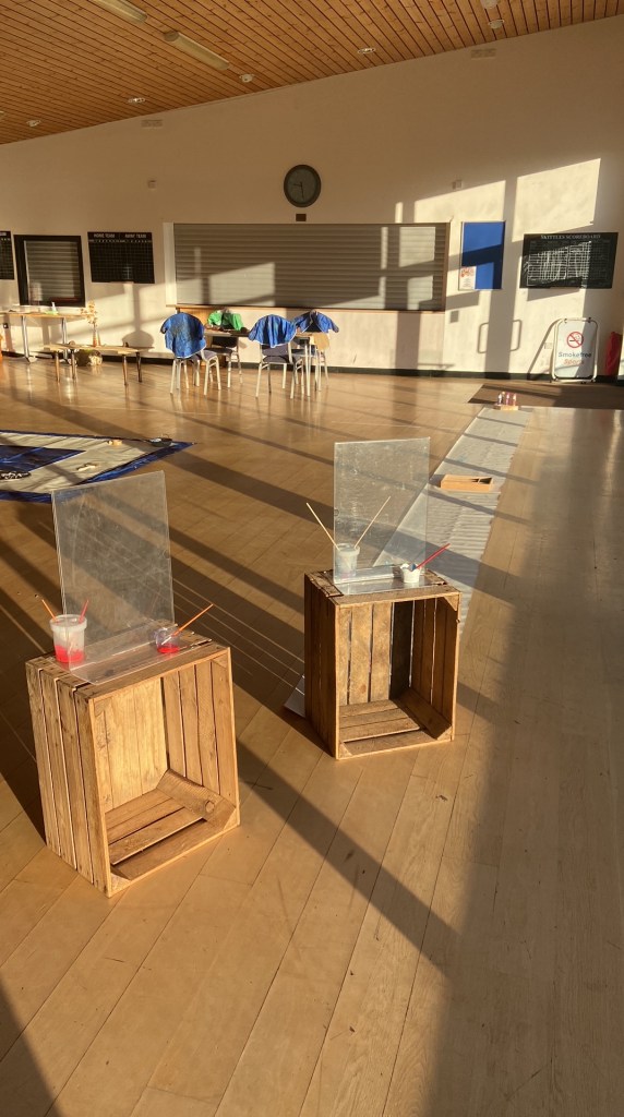 Adjacent to this, we propped up some painting easels using wooden crates and plastic display stands, which we acquired from a local clothing store that closed down in Crewkerne. Our original plan was to peg paper up onto each stand, however, with the beautiful sunlight shining through the windows, we chose to let the children paint directly onto them.