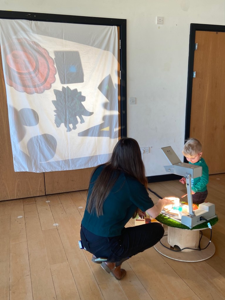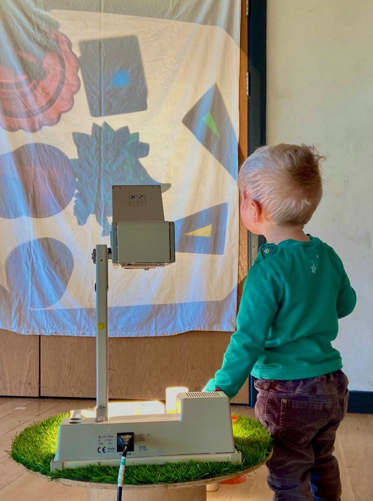 Another part of the room offered some light, shadow and colour play using an overhead projector. The children were naturally fascinated by the array of colours projected onto a hanging sheet, and some played for extended periods, moving objects around the base, observing the results with curiosity and excitement. Projectors provide a rich creative learning experience for children, and we hope our projector will stand the test of time for the duration of this project. This particular overhead projector was found on Marketplace for £10 – an absolute bargain. If you know of a school or setting wishing to donate a projector to our project, please get in touch – we would love to add another one to the provision!