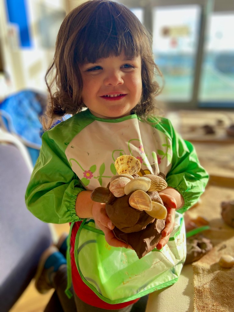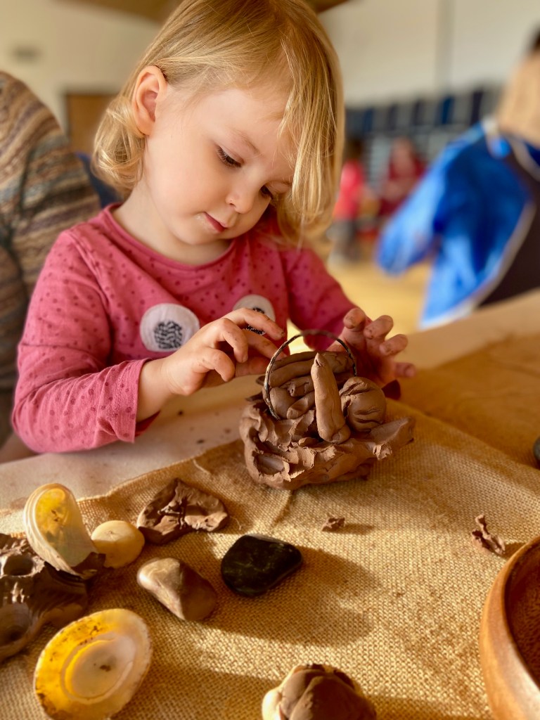 It was fascinating to observe the children work with the clay. Some children seemed to enjoyed poking holes into it – making ‘eyes’ for imaginary creatures, whilst others pressed different shells into structures to make sharp exteriors and lines. One child sat for over 30 minutes making an array of animals and objects, communicating their fascinations with their grown-up, in a wonderful creative dialogue. As well as this, it was the perfect time to talk to the families and get to know them more.