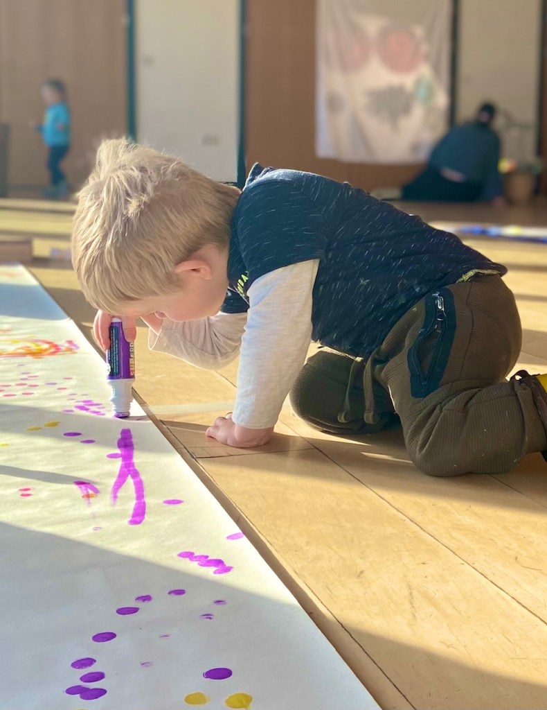 Running alongside the large floor-to-ceiling windows, we secured rolls of wallpaper and offered bingo daubers and children’s crayons. The beautiful thing about paper on the floor, is that it automatically invites children into play. Children are free to kneel, lay-down, and crawl around at ease. Many families enjoyed exploring the bingo daubers/paint markers, which were easy for the children to make dots and lines. Through our explorations, the children discovered that they could mix colours using them – an exciting discovery!
