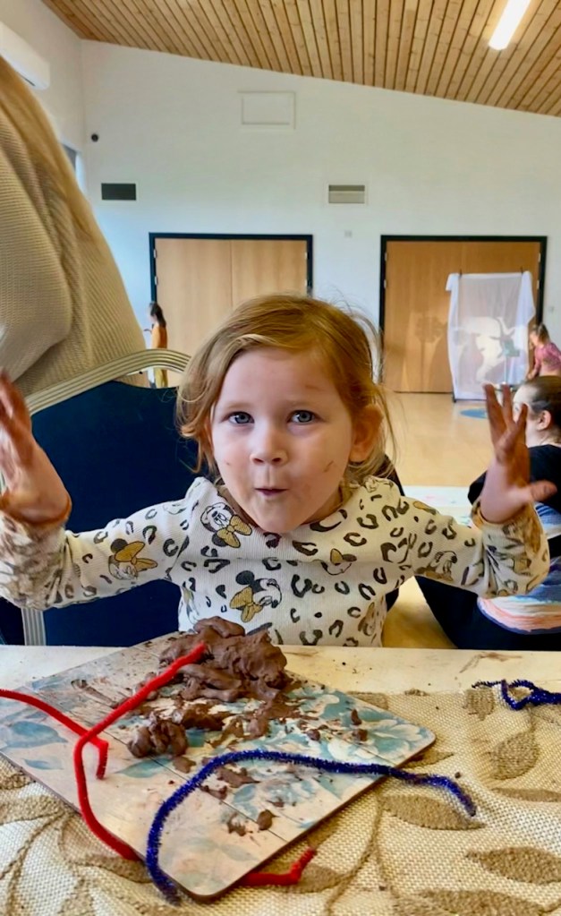 On the clay table, we offered clay and different coloured pipe cleaners. Some children made ‘trees’, ‘doors’, ‘bracelets’ and ‘bridges’. Some simply enjoyed poking holes in the clay and twisting the pipe cleaners around each other. I noticed a few older siblings, sat for a while manipulating the clay into balls and bowl shapes, quietly observing others in their creative play. Clay can be very therapeutic – it is cold to touch, extremely messy, but wonderfully malleable and imaginative.
