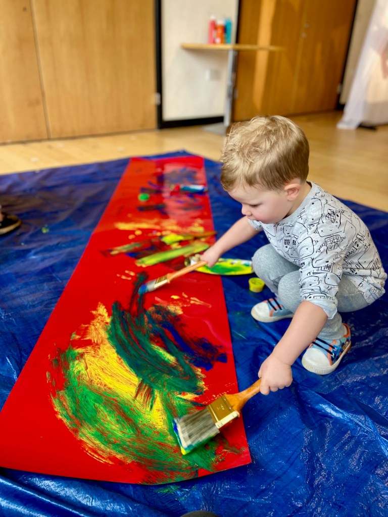 The red sheet offered a bright backdrop for children to create colourful marks with paintbrushes, corks, and different circular objects – we even had little hands and toes making marks too.