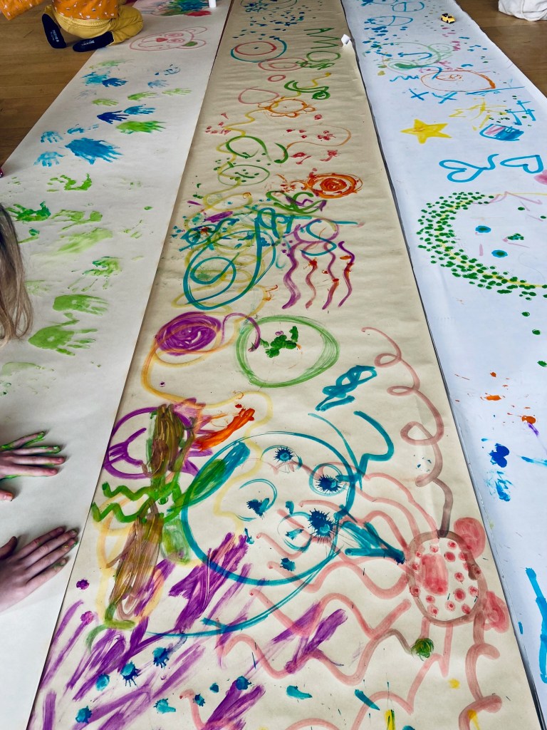 The creative explorations on large paper last week were mesmerising – so many children and grown ups adding to the work of art; we saw flowers, faces, lines, dots, circles, names, handprints and even solar systems!