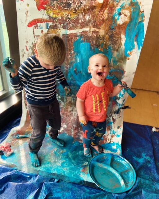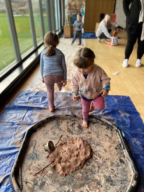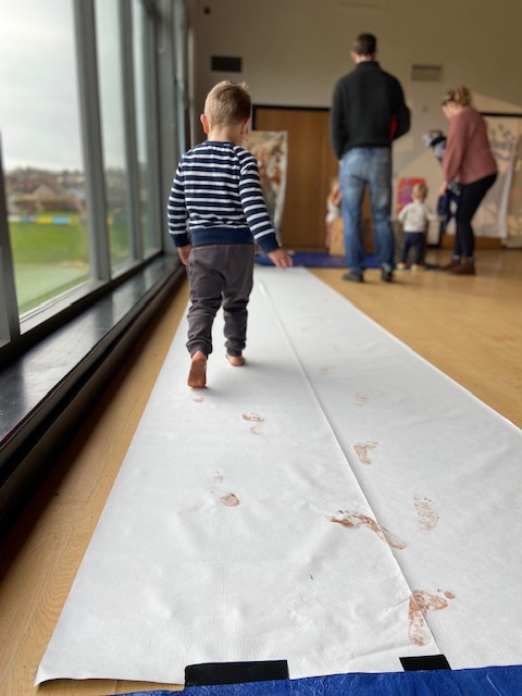 Our sessions run from 9:30 am until 11:30 am, and for the first half an hour, there was little interest in the clay on the floor. Some children looked at it, poked a paintbrush in it, and then wondered off to find something else to do. It wasn’t until I played alongside one boy who was feeling it with his hands and asked him, “I wonder what it would feel like on your toes?”. His face lit up with curiosity and told me he wanted to find out. His mother helped take it socks off and he started walking on the mound.