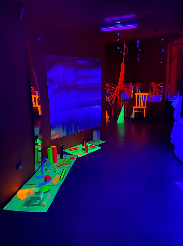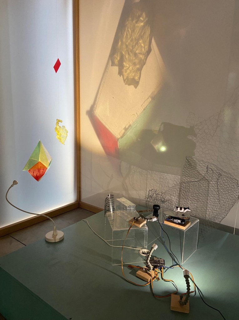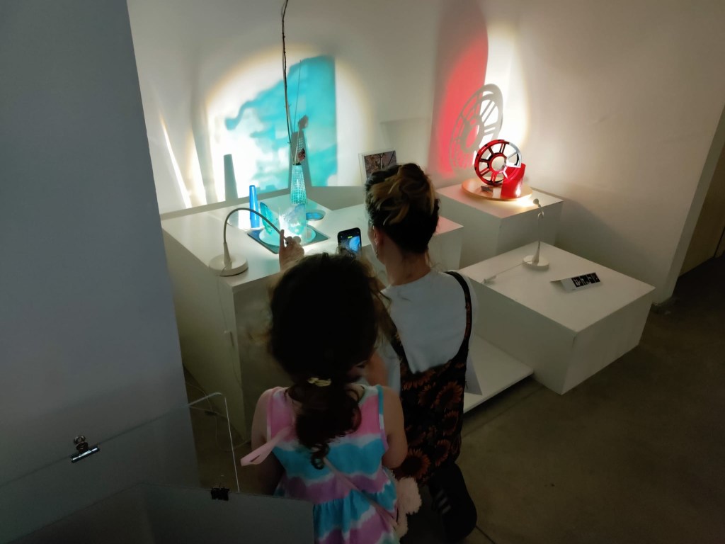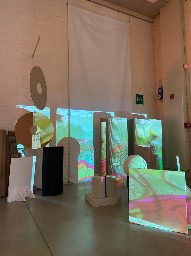 Moving through into the atelier, the beauty and magic continues. On one side of the studio there were large tubes and geometric shapes placed around the space, with digital images projected onto it. My daughter and I gasped with excitement seeing the rays of colour and light across the room.
