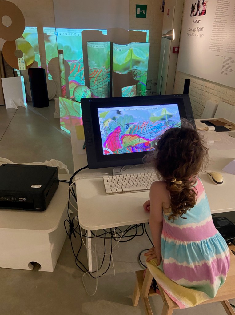 Downstairs, past the digital landscapes atelier, we found an exhibition room dedicated to children’s storytelling. I have always felt passionate about creating opportunities for children to share their own narratives and creative imaginations. During my teaching practice, I’ve taken time to listen to children’s stories, and dictate them word for word, recording them in a little book. These stories would then be shared amongst the class (and to parents/caregivers) on a taped out stage – often known as ‘Helicopter Stories’ by Trisha Lee, hugely inspired by the teachings of Vivian Gussin Paley. Listening to children’s ‘stories in their head’ allows us to get to know the child on a deeper level, find out their interests, loved family members, friends and fascinations. It also allows children to become storytellers, without the need for writing a story or following a prompt.