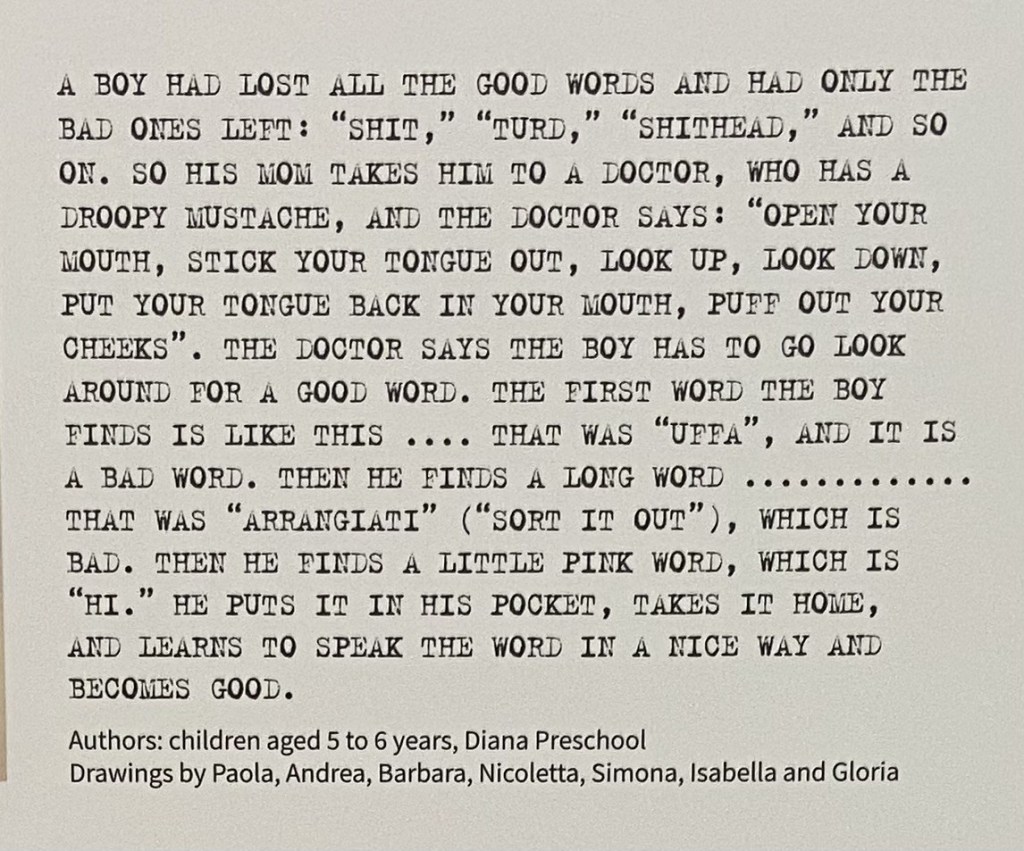 At the Loris Malaguzzi Centre they presented many stories and illustrations from children from schools in Reggio. One that I particularly enjoyed was the following story, written by a group of 5 and 6 year-olds from the Diana Preschool: