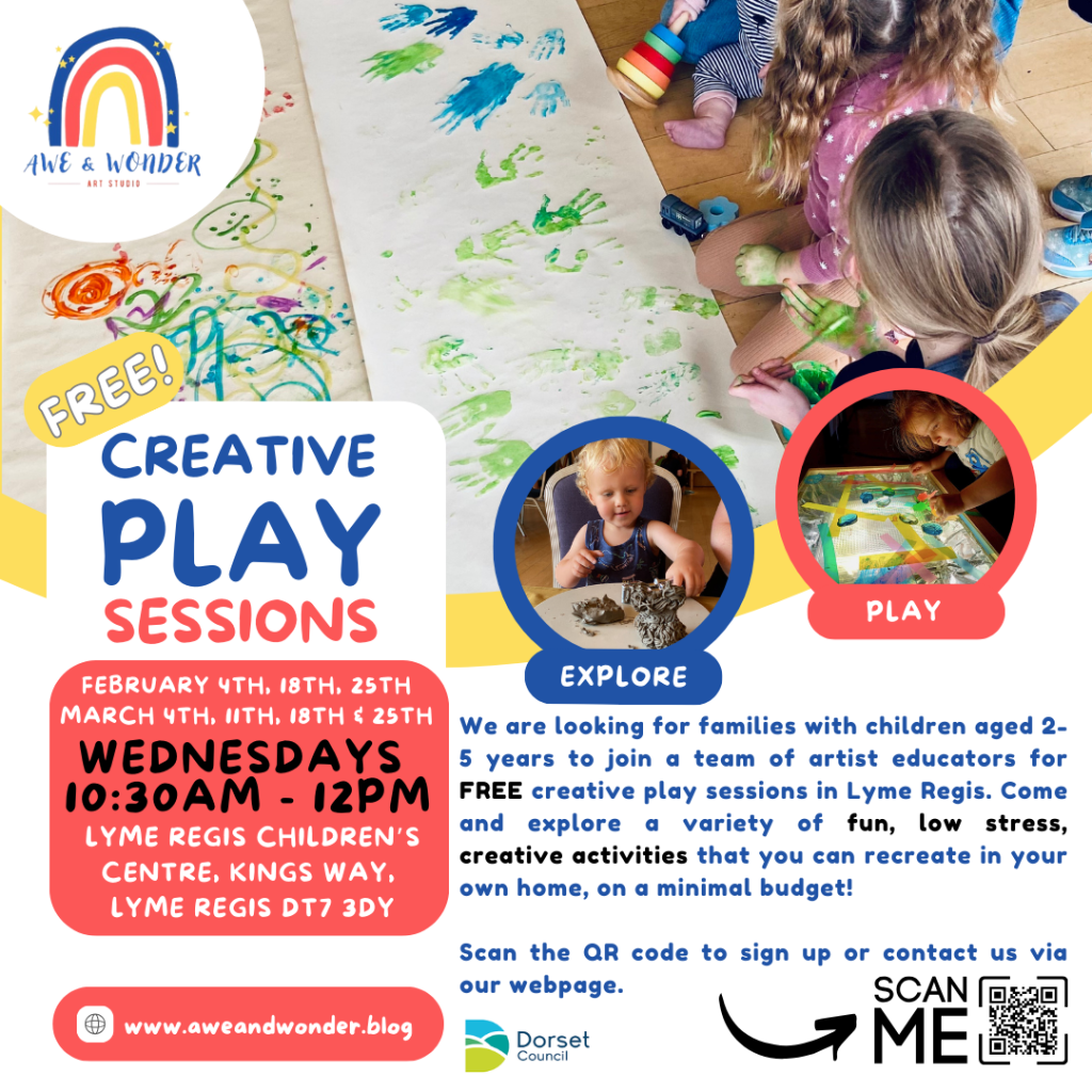 Dorset Council awarded us a grant to support the development of Best Start in Life Community support, by delivering programmes at Bridport Family Hub and Lyme Regis Children’s Centre to support families in Creative Play. Our sessions at Bridport Family Hub have now finished, but we will be running the sessions in Lyme Regis soon. If you are interested in finding out more about these sessions, please sign up via the QR code or email Victoria on aweandwonderuk@outlook.com.